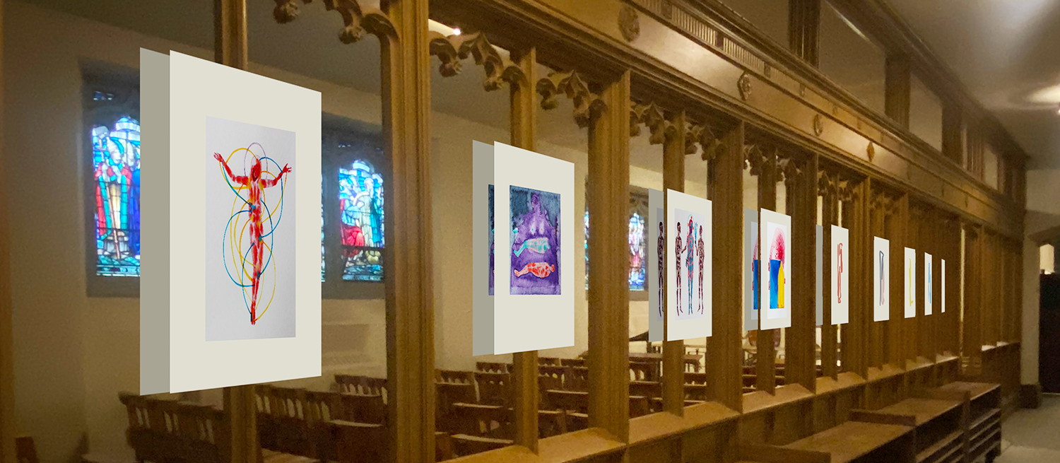 Dr. Sobkovych has previously displayed this artwork in Germany, where she lived en route to Canada. Our worship space is ideal for it, since the art centers on the themes of Jesus’ passion and death. It may feel a little like the Stations of the Cross tradition in which our Catholic siblings engage, but it is not quite that. The Stations are designed to help us ponder 15 steps on Jesus’ Via dolorosa, whereas these works aren’t so narrowly focused on those moments in the passion.