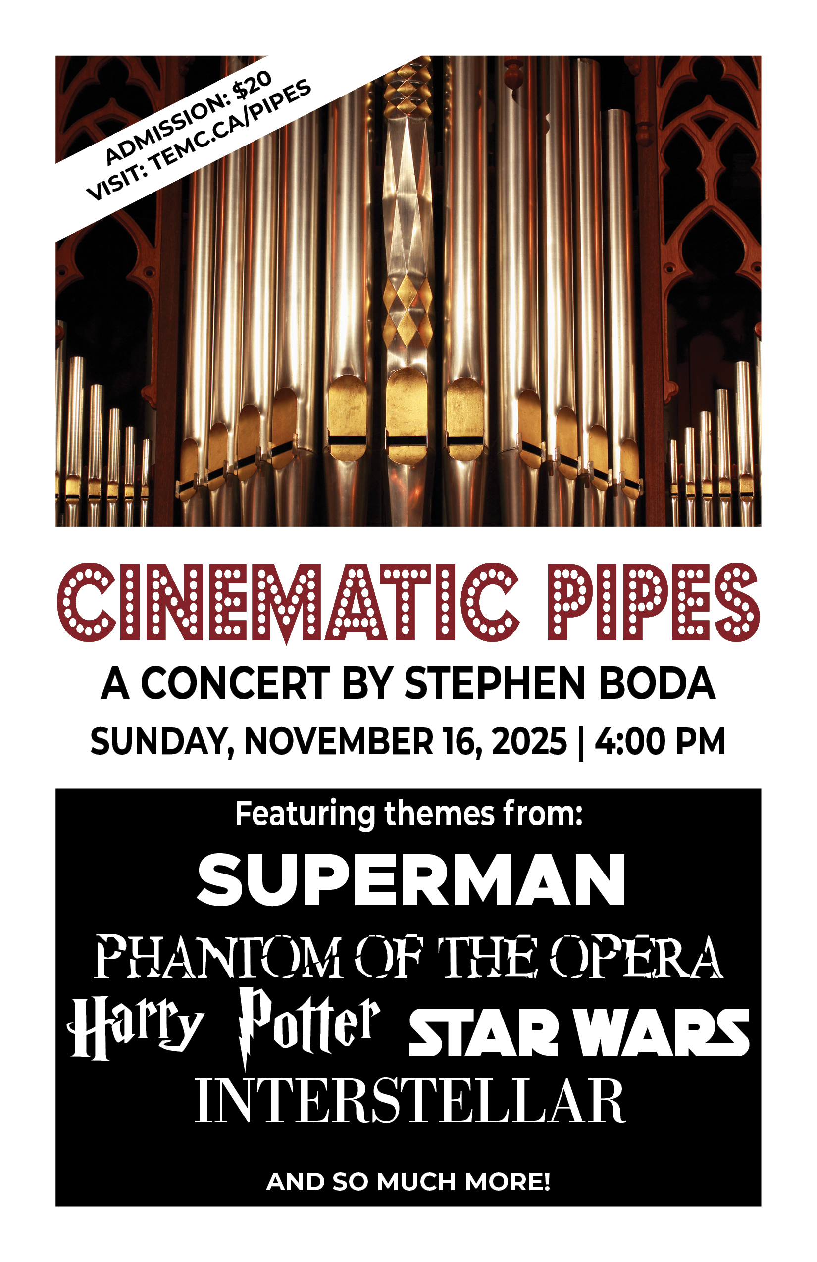 A Night at the Movies… on the Organ! Step into a world where film and music collide! Experience the breathtaking power of the organ as it brings to life cinematic masterpieces from Phantom of the Opera, Harry Potter, Star Wars, and Interstellar. This family-friendly concert combines spectacular visuals, thrilling soundscapes, and dazzling special effects for an unforgettable journey through your favourite movie moments.