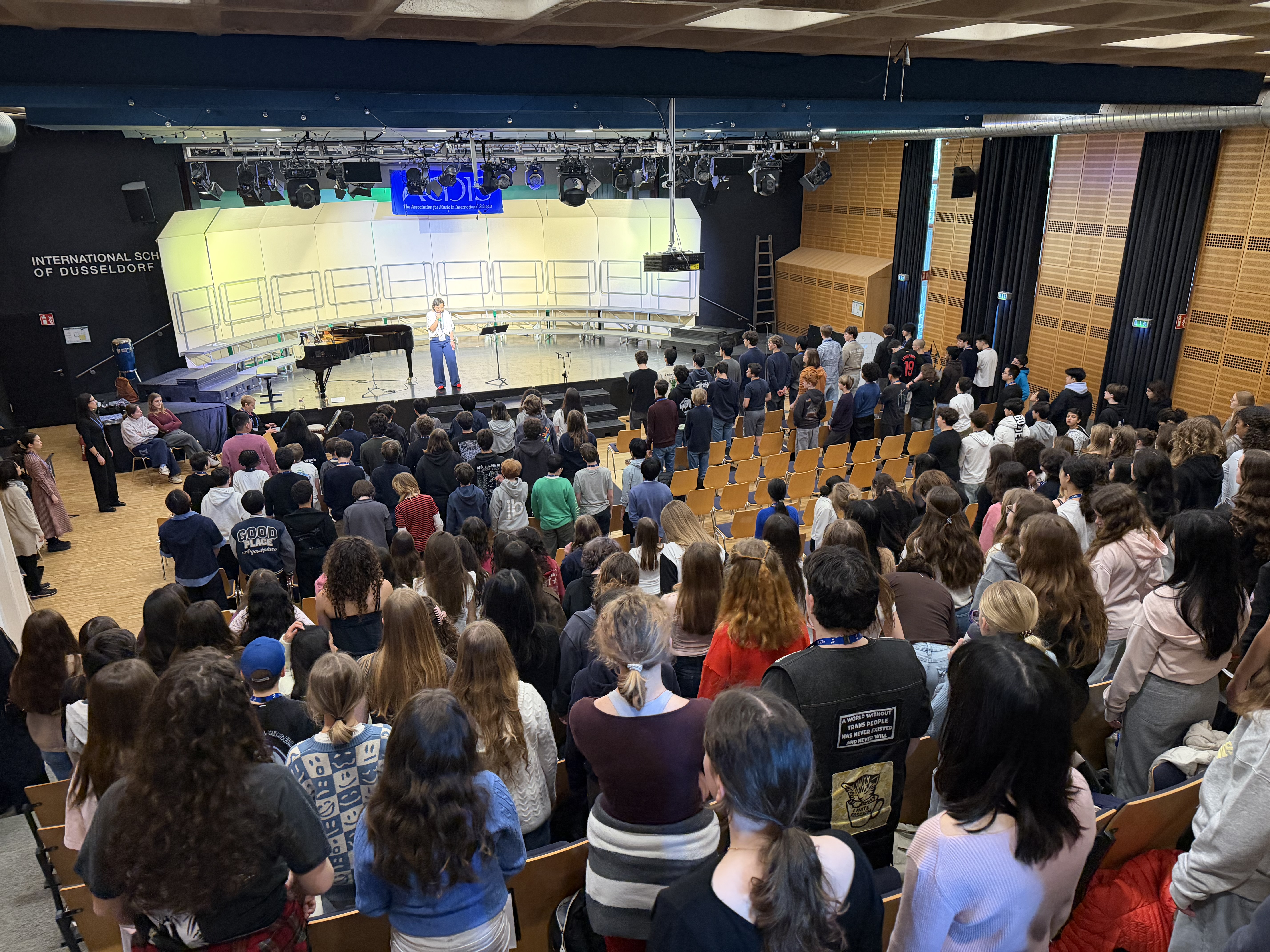 We performed 8 pieces together (concert program). Although every piece was chosen for a reason, there are definitely a few performance highlights. First, the students sang a piece in Mandarin - 蒲公英 (Dandelion), and to hear them sing it like they genuinely understand each character was absolutely moving. Second highlight - we did a TaReKiTa! by Reena Esmail (a South Indian- American) composer. Two South Asian students, one from Belgium, another from Switzerland, asked to introduce it at the concert together. In their emcee speech, they said this was the first time they understood diversity efforts, because they saw themselves and their culture represented. We ended with sîkwakhi by Sherryl Sewepagaham (Woodland Cree composer from Little Red River - an indigenous community in Alberta) and sang it in Woodland Cree (in Germany!) combining with 100 middle school choir students. Sherryl had zoomed in for an hour session (on her way to the Juno ceremony!). These students had no idea why this was important to Canadians. sîkwakhi opened a door for international students to learn about truth and reconciliation, and hopefully to long to learn more.